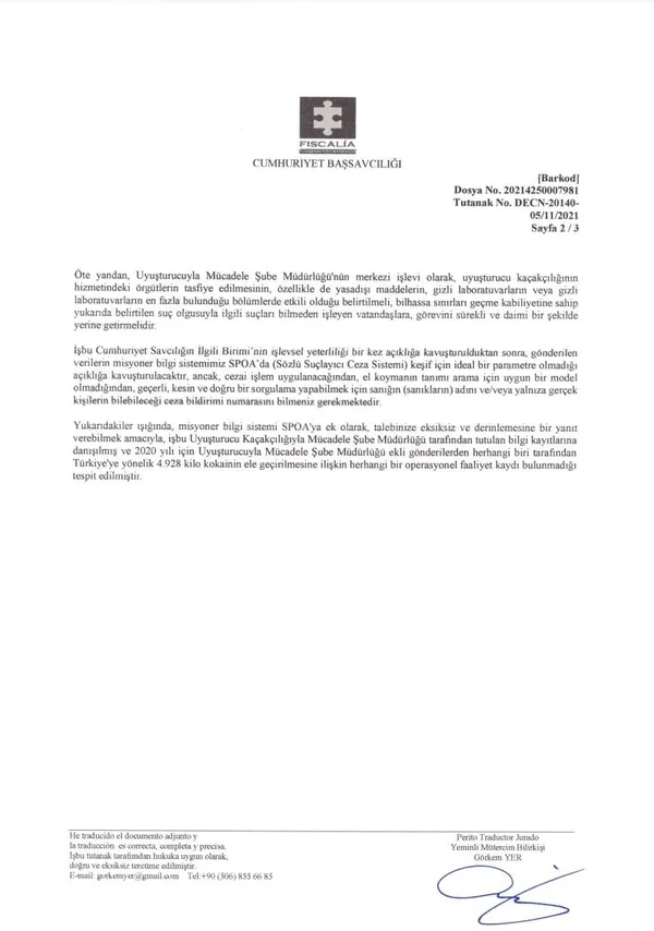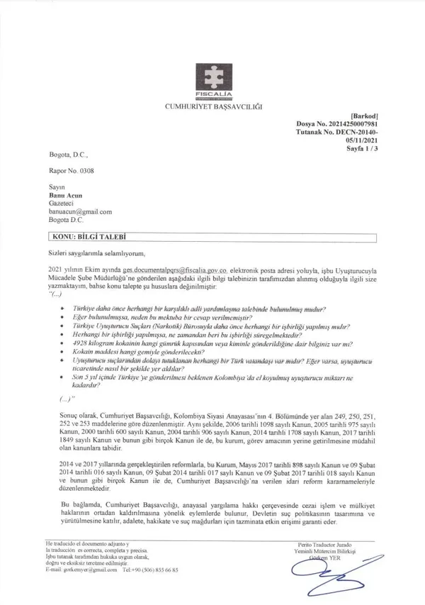 Kolombiya narkotik biriminden alındığı söylenen İspanyolca belgede, 22/09/2021 tarihinde Türkiye'ye adli istinabe talebinde bulunulduğuna ilişkin bir ifade yer almamaktadır. Belgenin resmi tercümesi açıklamamız ekindedir.