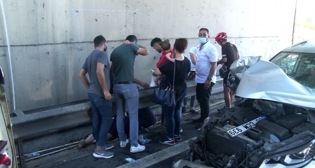 Bahçelievler Basın Ekspres yolunda yolcu indiren minibüse, arkadan gelen otomobil çarptı. Kazada kucağında 1.5 yaşındaki çocuğu olan kadın, yola fırlayarak bariyerlerin arkasına düştü. Kazada kadın yaralanırken, çocuğu ise yara almadı.