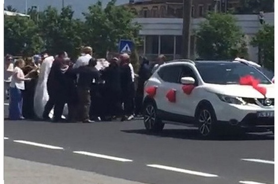 Ancak düğün konvoyunda bir sürücü, gelin aracının önüne geçerek yolu trafiğe kapatmaya çalıştı.