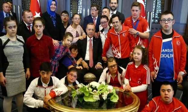 Cumhurbaşkanı Recep Tayyip Erdoğan, 21 Mart Dünya Down Sendromu Günü nedeni ile Cumhurbaşkanlığı Külliyesi'nde Down Sendromlu çocuklar ve aileleri ile bir araya geldi. Down Sendromlu çocuklarla fotoğraf çektiren Erdoğan, bir kız çocuğuna kollarını açıp “Ben seni var ya bu kadar seviyorum" diyerek küçük kızın elinden öptü.