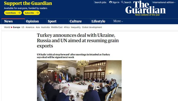 The Guardian'daki haberde ise, gelecek hafta imzalanacak anlaşma ile Türkiye'nin milyonları açlık riskine maruz bırakan tahıl krizinde umut ışığı olduğu ifade edildi.