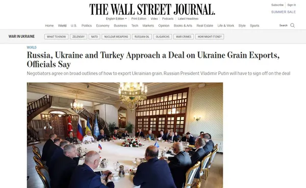 Amerikan Wall Street Journal gazetesinde yer alan haberde, İstanbul'da yapılan zirvede Ukrayna limanlarında bekleyen tahıl ve gıda maddelerinin sevkine ilişkin bir anlaşmya varıldığı ancak bunun Putin tarafından da onauylanması gerektiğine dikkat çekildi. Başkan Erdoğan ve Putin arasında Tahran'da gerçekleşecek zirveye işarete eden yetkililerin bu görüşmede imzanın atılacağına inandığı ifade edildi.