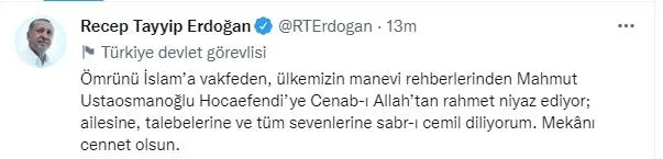 Başkan Recep Tayyip Erdoğan, hayatını kaybeden İsmailağa Cemaati lideri Mahmut Ustaosmanoğlu için taziye mesajı yayımladı.