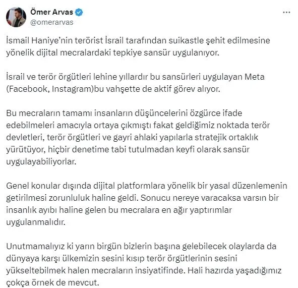 Meta'nın sansürüne tepki gösteren AK Parti Tanıtım ve Medya Başkan Yardımcısı Ömer Arvas; İsmail Haniye'nin terörist İsrail tarafından suikastle şehit edilmesine yönelik dijital mecralardaki tepkiye sansür uygulanıyor. İsrail ve terör örgütleri lehine yıllardır bu sansürleri uygulayan Meta (Facebook, Instagram)bu vahşette de aktif görev alıyor. Bu mecraların tamamı insanların düşüncelerini özgürce ifade edebilmeleri amacıyla ortaya çıkmıştı fakat geldiğimiz noktada terör devletleri, terör örgütleri ve gayri ahlaki yapılarla stratejik ortaklık yürütüyor, hiçbir denetime tabi tutulmadan keyfi olarak sansür uygulayabiliyorlar.
