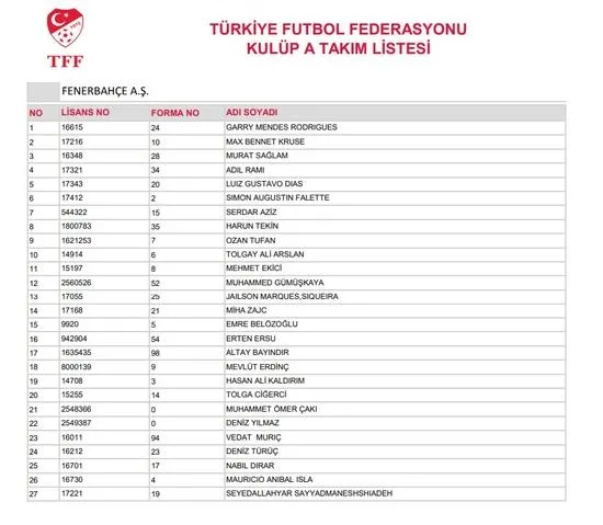 2019-2020 Sezonu Süper Lig ve TFF 1. Lig'de mücadele eden kulüplerin İkinci Transfer Tescil Dönemi sonrası; forma numarası bilgilerini de içeren, Resmi A Takım Oyuncu Listeleri açıklandı. Fenerbahçe'de gözden çıkarılan Alper Potuk, sakatlığı bulunan Sadık Çiftpınar TFF'ye bildirilen listede yer almadı.