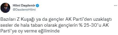 Resmi sosyal medya hesabından paylaşımda bulunan Optimar Araştırma Şirketi Başkanı Hilmi Daşdemir, “Bazıları Z Kuşağı ya da gençler AK Parti’den uzaklaştı sesler de hala taban olarak gençlerin % 25-30’u AK Parti’ye oy verme eğiliminde” dedi.