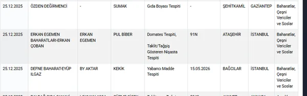 Listede dikkat çeken bir diğer ürün baharatlar oldu. Gaziantep'te bir, İstanbul'da iki firmanda satılan pul biber, sumak ve kekikte gıda boyası, nişasta, ve yabancı madde bulundu.