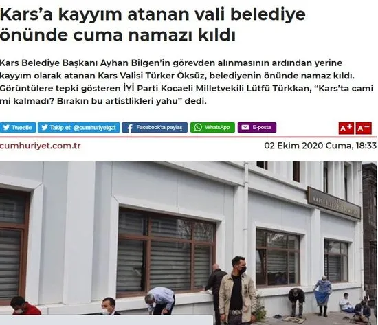 Cumhuriyet Gazetesi: "Kars'a kayyım atanan vali belediye önünde cuma namazı kıldı"