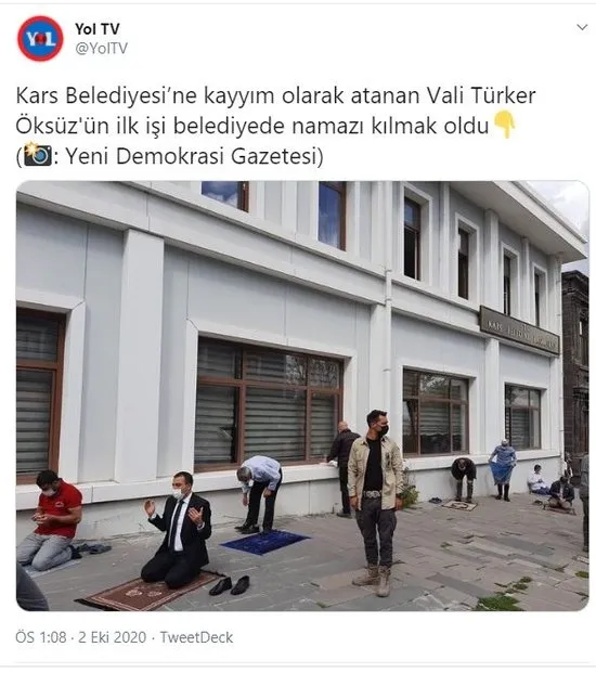 Yol TV: "Kars Belediyesi'ne kayyım olarak atanan Vali Türker Öksüz'ün ilk işi belediyede namazı kılmak oldu"