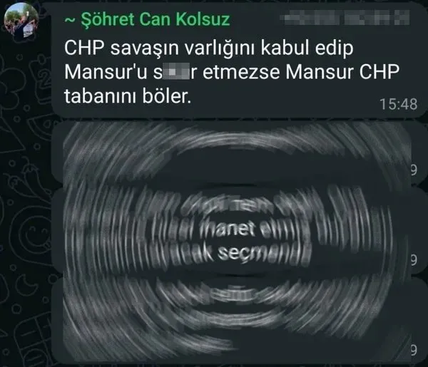 Siyaset Bilimci Nezih Onur Kuru, Burak Yıldırım ve Şöhret Can Kolsuz'un yer aldığı gruptaki mesajlaşmalarda, özellikle İmamoğlu'na yakın ve CHP Gençlik Kolları Başkanlığı için de oynayan Şöhret Can Kolsuz'un Mansur Yavaş'a yönelik, "CHP savaşın varlığını kabul edip Mansur'u s....r etmezse CHP tabanını böler. Anadolu'da siyaset yapıyorum ve bunu görüyorum. Mansur hem CHP'li hem değil. Ona oy verme hissi ihanet etmiş duygusu uyandırmayacak seçmende. Bugünden kabul edip saldırı olmazsa Mansur %10 almayacak. %25-30'la başlayacak maça..." sözleri dikkat çekiyor.