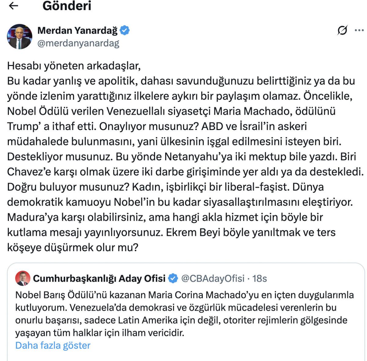 Merdan Yanardağ, Ekrem İmamoğlu'nun sosyal medya ekibine tepki gösterdi. İmamoğlu’nun, Nobel Barış Ödülü kazanan Maria Corina Machado’yu kutladığı paylaşımı alıntılayan Yanardağ "Bu kadar yanlış, apolitik ve savunduğunuz değerlere aykırı bir paylaşım olamaz" dedi.