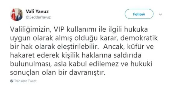 Bu sözlerle ilgili Ordu Valiliği yasal işlem başlattığını duyurdu. Ordu Valisi Seddar Yavuz Twitter'dan yaptığı açıklamada,"Valiliğimizin, VIP kullanımı ile ilgili hukuka uygun olarak almış olduğu karar, demokratik bir hak olarak eleştirilebilir. Ancak, küfür ve hakaret ederek kişilik haklarına saldırıda bulunulması, asla kabul edilemez ve hukuki sonuçları olan bir davranıştır." ifadelerine yer verdi.