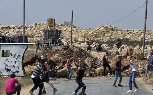İllüstrasyon: 22 Temmuz 2017'de, Batı Şeria'daki Kobar köyünde Filistinli protestocular İsrail askerlerine taş atarken, bir ordu buldozeri, saldırıyı gerçekleştirmekle suçlanan bir Filistinlinin evinin hazırlanması operasyonu sırasında bölgeye giden ana yolu kapatıyor. (AP Fotoğrafı/Nasser Nasser)
