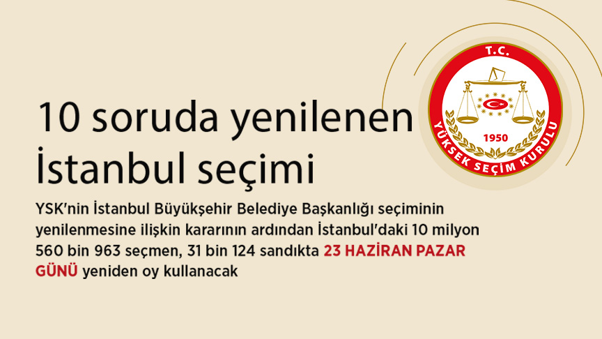 YSK, AK Parti'nin İstanbul seçim sonuçlarıyla ilgili itirazında kararını verdi. İstanbul Büyükşehir Belediye Başkanlığı seçiminin yenilenmesine, Ekrem İmamoğlu'nun mazbatasının iptaline karar verildi. Bu durumda, İstanbul'daki 10 milyon 560 bin 963 seçmen, 31 bin 124 sandıkta 23 Haziran Pazar günü yeniden oy verecek. Peki İstanbul'da seçim süreci nasıl işleyecek? İşte 10 soruda yenilenen İstanbul seçiminde merak edilenler