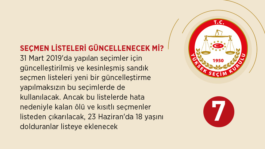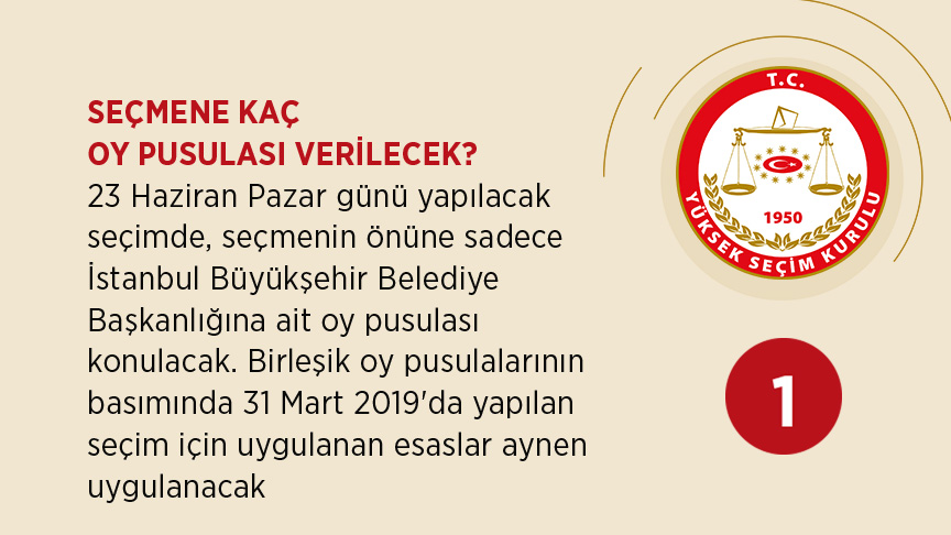 Yüksek Seçim Kurulunun (YSK) İstanbul Büyükşehir Belediye Başkanlığı seçiminin yenilenmesine ilişkin kararının ardından İstanbul'daki 10 milyon 560 bin 963 seçmen, 31 bin 124 sandıkta 23 Haziran Pazar günü yeniden oy kullanacak. 31 Mart 2019'da yapılan seçimler için güncelleştirilmiş ve kesinleşmiş sandık seçmen listeleri yeni bir güncelleştirme yapılmaksızın bu seçimlerde de kullanılacak. Ayrıca bu seçimle ilgili seçim takvimi, YSK tarafından değil, İstanbul İl Seçim kurulunca hazırlanacak.