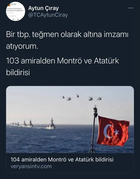 İYİ Parti Genel Başkan Başdanışmanı ve İzmir Milletvekili Aytun Çıray da bildiriye destek vererek, Twitter hesabından "Bir tabip teğmen olarak altına imzamı atıyorum. 103 amiralden Montrö ve Atatürk" bildirisi mesajını yazdı.
