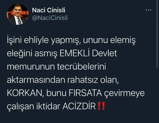 İYİ Parti Erzurum Milletvekili Naci Cinisli: "İşini ehliyle yapmış, ununu elemiş eleğini asmış emekli devlet memurunun tecrübelerini aktarmasından rahatsız olan, korkan, bunu fırsata çevirmeye çalışan iktidar acizdir"