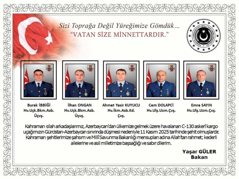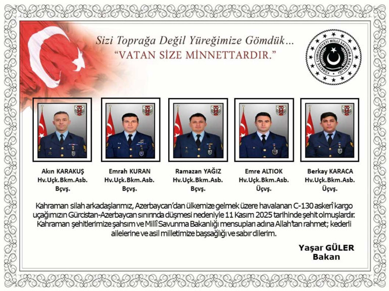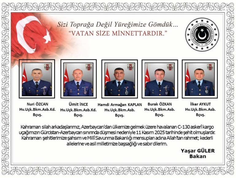 Milli Savunma Bakanlığı (MSB), Azerbaycan-Gürcistan sınırında düşen askeri kargo uçağında şehit olan askerlerin kimlik bilgilerini paylaştı.
