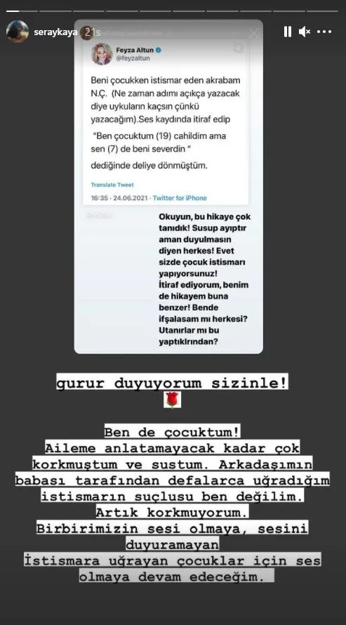 O isimlerden biri olan oyuncu Seray Kaya, Instagram hesabından yaptığı bir paylaşımla, arkadaşının babası tarafından istismara uğradığını açıkladı.
