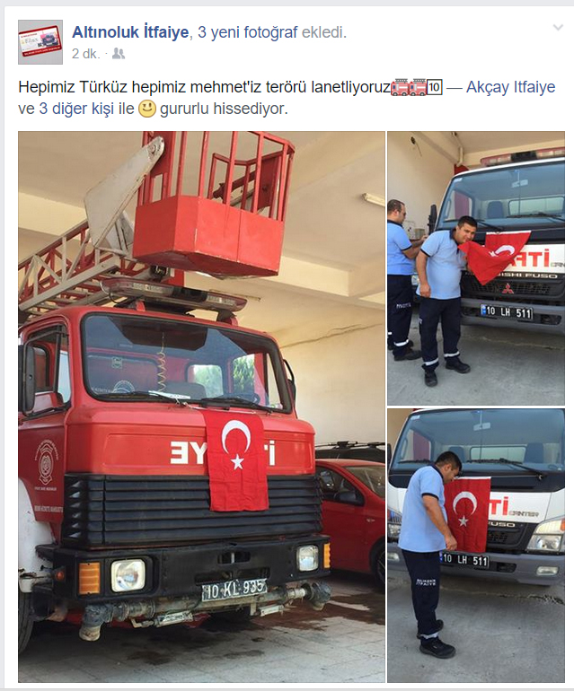 Edremit’in Altınoluk İtfaiye Müfrezesi’nin sosyal paylaşım sitesi üzerinden yaptığı paylaşım takdir topladı. İtfaiyeciler son günlerde yaşanan terör olaylarında şehit olan askerlerimiz için araçlarına Türk bayrağı asarak “Hepimiz Türk'üz, hepimiz Mehmet'iz. Terörü lanetliyoruz” paylaşımını sosyal medya üzerine yazdı. İtfaiyeciler gün boyunca göreve Türk bayraklı araçları ile yangınlara gidecek.