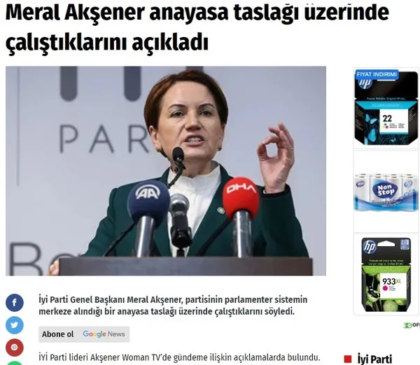 * İddiaları reddeden İYİ Parti Genel Başkanı Meral Akşener'in geçen yıl 28 Temmuz'da, "24 Haziran'dan itibaren yürüttüğümüz bir anayasa taslak metnimiz var." dediği ortaya çıktı. Ancak aynı Meral Akşener, 18 gün önce, 12 Kasım'da kendisini yalanlayarak, "Hiçbir siyasi oluşum, platform, şahıs, partiyle herhangi bir anayasa çalışmamız yoktur" ifadelerini kullandı.