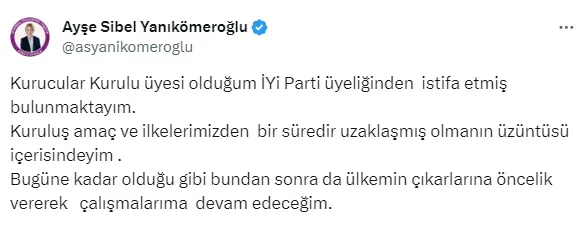 "Kurucular Kurulu üyesi olduğum İYi Parti üyeliğinden istifa etmiş bulunmaktayım. Kuruluş amaç ve ilkelerimizden bir süredir uzaklaşmış olmanın üzüntüsü içerisindeyim.