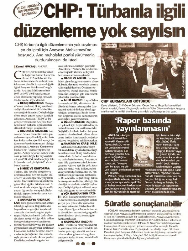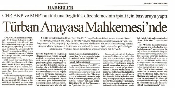 27 Şubat 2008: CHP ve DSP, üniversitelerde başörtüsüne serbestlik getiren yasanın iptali için Anayasa Mahkemesi'ne başvurdu. Dava dilekçesi, CHP Genel Sekreteri Önder Sav ve Grup Başkanvekilleri Kemal Anadol, Kemal Kılıçdaroğlu ve Hakkı Süha Okay tarafından Anayasa Mahkemesi'ne verildi.