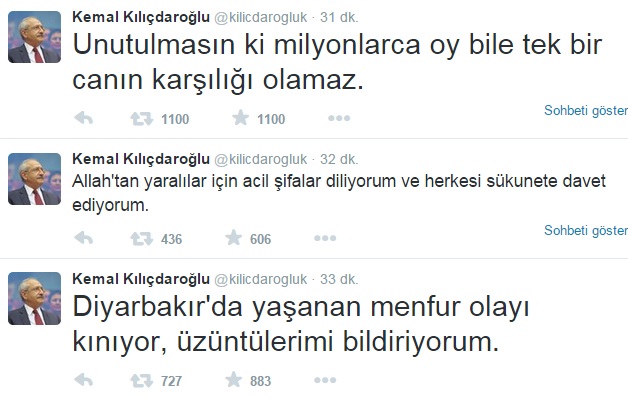 Cumhuriyet Halk Partisi (CHP) Genel Başkanı Kemal Kılıçdaroğlu, Diyarbakır’da HDP mitingindeki patlamayla ilgili resmi Twitter hesabından bir açıklama yaptı. CHP Lideri attığı tweetlerde, ‘’Diyarbakır’da yaşanan menfur olayı kınıyor, üzüntülerimi bildiriyorum. Allah’tan yaralılar için acil şifalar diliyorum ve herkesi sükunete davet ediyorum. Unutulmasın ki milyonlarca oy bile tek bir canın karşılığı olamaz’’ ifadelerini kullandı.