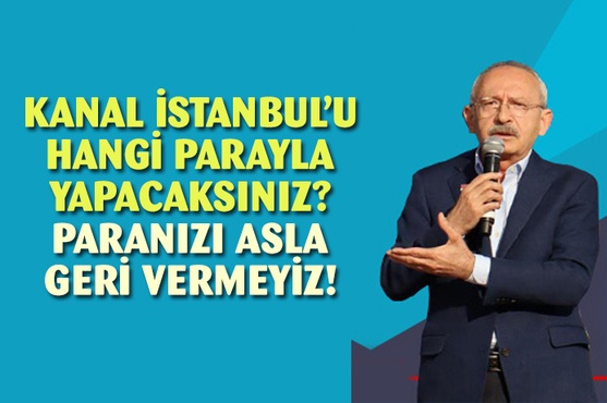 Kanal İstanbul projesinin şehre ihanet olduğunu söyleyen Kılıçdaroğlu, "Neye göre yapacaksınız. Herkes hayır diyor. Bir kişi ben yapacağım diyor. Hangi akıl, hangi mantık, hangi fizibilite, hangi para? Yapamazsın kardeşim. Zaten gideceksin. İlk seçimde gideceksin. Açık ve net söylüyorum. Hiç kimse 5 kuruş para ayırmaya kalkmasın. Ayırdıkları paranın kuruşu dahi verilmeyecektir. Bir tarihe rant gözüyle bakılabilir mi? " açıklamasında bulunarak yatırımcıyı açık açık tehdit etti.
