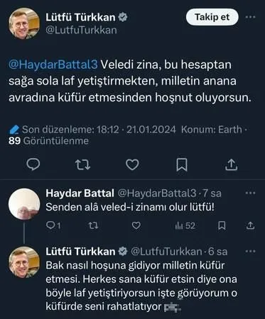 "Veledi zina, bu hesaptan sağa sola laf yetiştirmekten milletin anana avradına küfür etmesinden hoşnut oluyorsun." Vatandaş bu ağır küfür ve hakaret karşısında "Senden ala veled-i zina mı olur lütfü!" diye yazınca, Türkkan yine küfür etti, şunu yazdı: