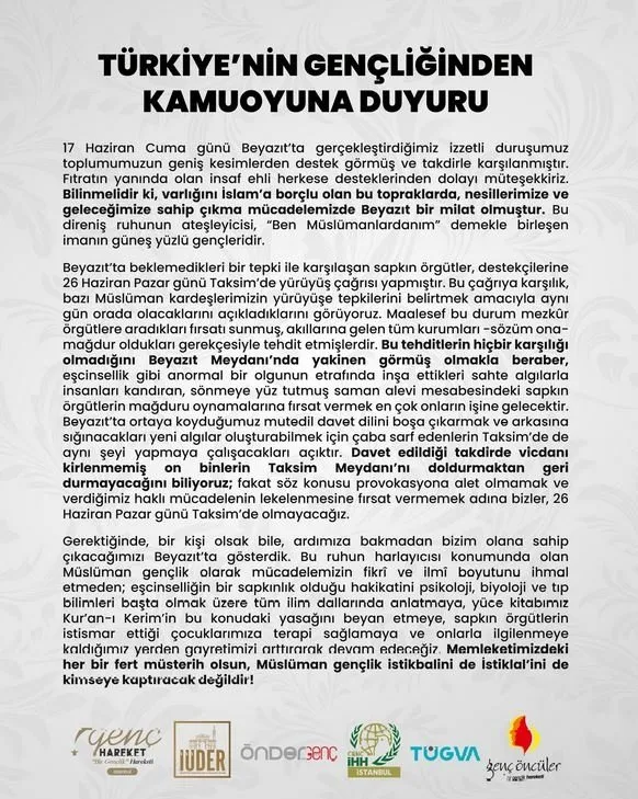 "Beyazıt'ta beklemedikleri bir tepki ile karşılaşan sapkın örgütler, destekçilerine 26 Haziran Pazar günü Taksim'de yürüyüş çağrısı yapmıştır. Bu çağrıya karşılık, bazı kardeşlerimizin yürüyüşe tepkilerini belirtmek amacıyla aynı gün orada olacaklarını açıkladıklarını görüyoruz. Maalesef bu durum mezkûr örgütlere aradıkları fırsatı sunmuş, akıllarına gelen tüm kurumları -sözüm ona- mağdur oldukları gerekçesiyle tehdit etmişlerdir. Bu tehditlerin hiçbir karşılığı olmadığını Beyazıt Meydanı'nda yakinen görmüş olmakla beraber, eşcinsellik gibi anormal bir olgunun etrafında inşa ettikleri sahte algılarla insanları kandıran, sönmeye yüz tutmuş saman alevi mesabesindeki sapkın örgütlerin mağduru oynamalarına fırsat vermek en çok onların işine gelecektir. Beyazıt'ta ortaya koyduğumuz mutedil davet dilini boşa çıkarmak ve arkasına sığınacakları yeni algılar oluşturabilmek için çaba sarf edenlerin Taksim'de de aynı şeyi yapmaya çalışacakları açıktır. Söz konusu provokasyona alet olmamak ve verdiğimiz haklı mücadelenin lekelenmesine fırsat vermemek adına bizler, 26 Haziran Pazar günü Taksim'de olmayacağız."