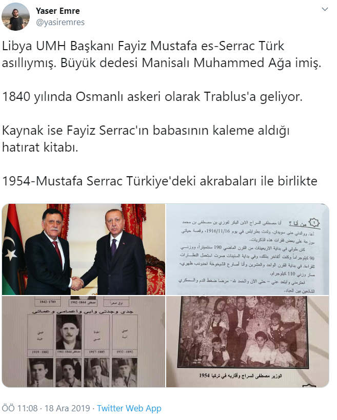 Libya'da Hafter'e karşı Türkiye tarafından desteklenen ve meşru Trablus hükümetinin başkanı olan Fayiz Mustafa es-Serrac'ın Türk asıllı olduğu ortaya çıktı. Serrac'ın Osmanlı vatandaşı olan dedesinin Manisalı olduğu ve 1840'da Trablus'a gittiği öğrenildi.