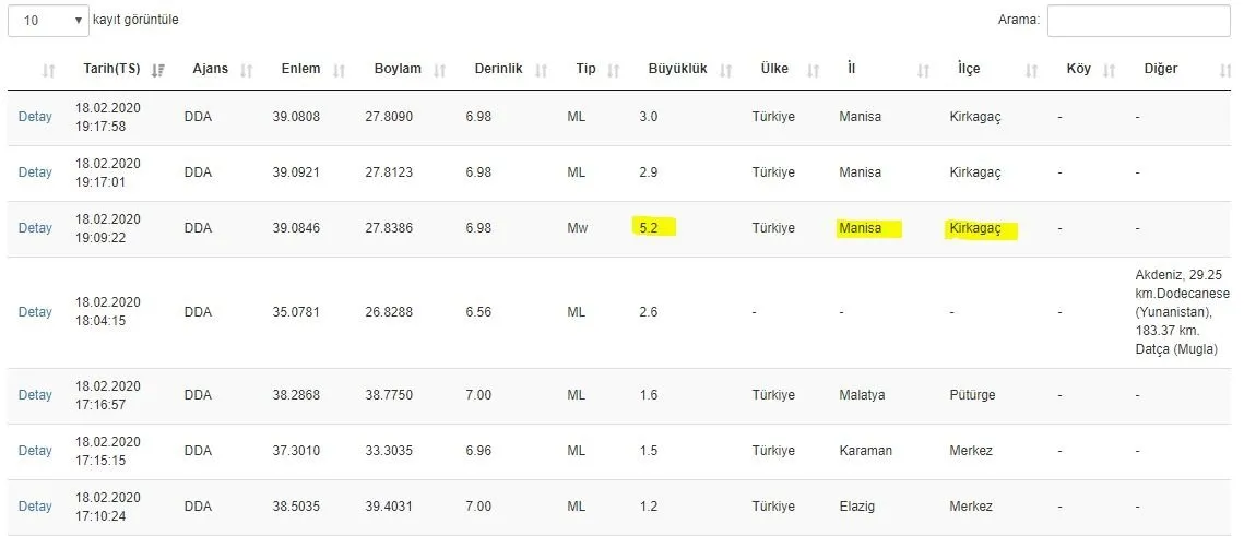 AFAD SON DEPREMLER LİSTESİ VERİLERİ