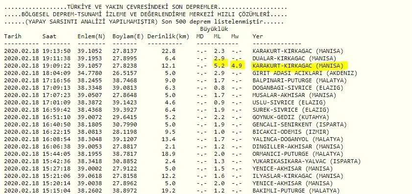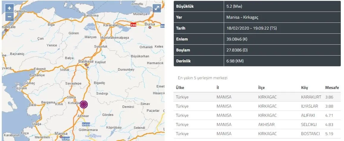 Boğaziçi Üniversitesi Kandilli Rasathanesi ve Afet ve Acil Durum Yönetimi Başkanlığı (AFAD)'ın sürekli olarak güncellediği ve kamuoyuna duyurdu son depremler listesine göre Manisa'da saat 19.09'da 4.9 şiddetinde bir son dakika depremi meydana geldi. AFAD verilerine göre ise depremin şiddeti 5.2 olarak belirlendi. Bu depremin ardından saat. 19.27'de 3.3 şiddetinde yeni bir deprem daha meydana geldi. Öte yandan saat 19.32'de 3.5 şiddetinde yeni bir deprem daha meydana geldi. Yerin 12.1 kilometre derinliğinde meydana gelen ilk depremin ardından çevre il ve ilçelerde yaşayan vatandaşlar da panik yaşadı. Peş peşe meydana gelen depremler Bursa, Balıkesir ve İzmir illerinde de yoğun olarak hissedildi.