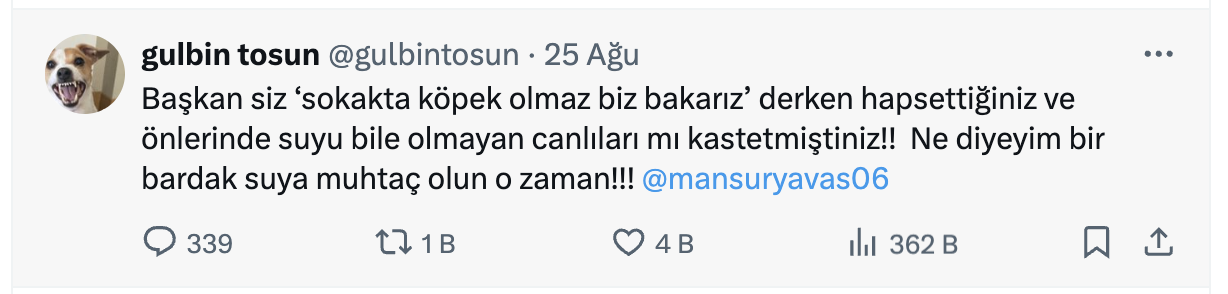 NOW TV Ana Haber Bülteni sunucusu Tosun, geçen günlerde X (Twitter) hesabından Mansur Yavaş’ı etiketleyerek, “Başkan siz ‘sokakta köpek olmaz biz bakarız’ derken hapsettiğiniz ve önlerinde suyu bile olmayan canlıları mı kastetmiştiniz! Ne diyeyim bir bardak suya muhtaç olun o zaman!!!” diye yazmıştı.