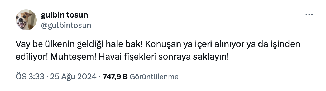 Tosun ardından yaptığı paylaşımda, “Vay be ülkenin geldiği hale bak! Konuşan ya içeri alınıyor ya da işinden ediliyor! Muhteşem! Havai fişekleri sonraya saklayın!” sözlerini kaydetmişti.