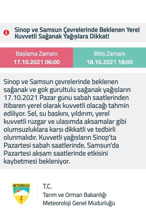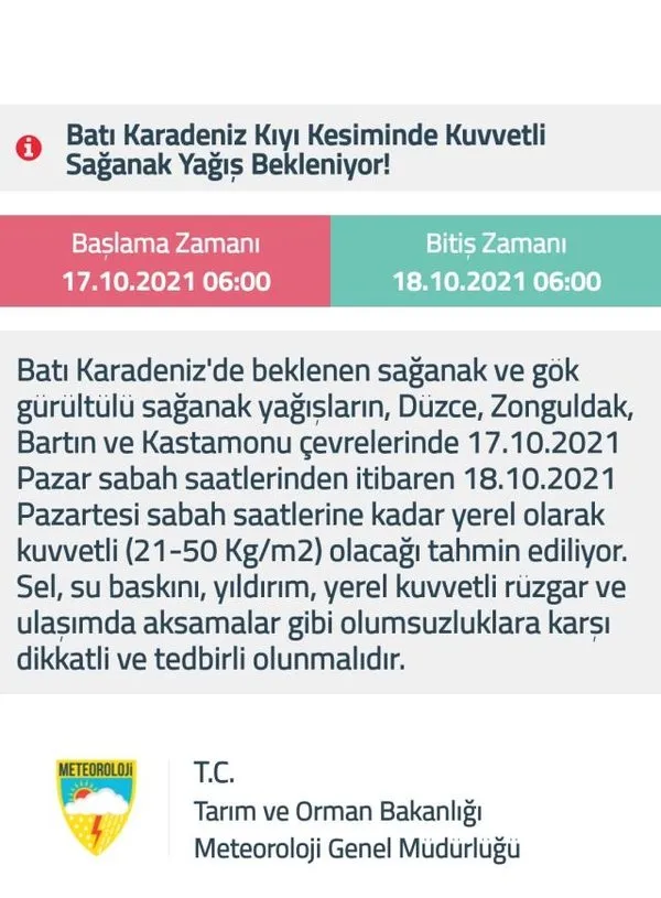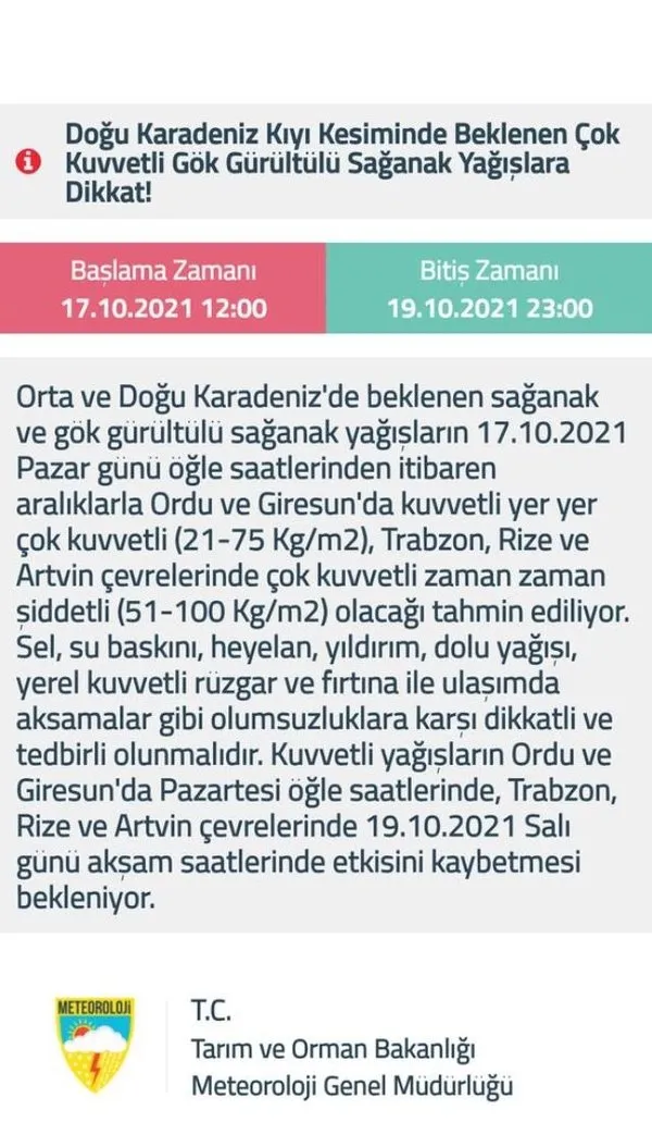 Öte yandan Meteoroloji Genel Müdürlüğü, Karadeniz'deki 11 ilimiz için kuvvetli yağış uyarısı yaptı. Ordu, Giresun, Trabzon, Rize, Artvin, Sinop, Samsun, Düzce, Zonguldak, Bartın ve Kastamonu'nun yer aldığı uyarıda yağışların yer yer 100 kilogramı bulacağı belirtilirken vatandaşların sel, su baskını ve heyelana karşı dikkatli olmaları istendi.