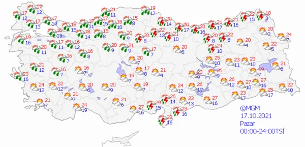 Meteoroloji Genel Müdürlüğü tarafından yapılan son değerlendirmelere göre; kuzey, iç ve batı kesimlerinin parçalı ve yer yer çok bulutlu, Marmara, Ege, Batı Akdeniz, İç Anadolu'nun kuzeybatısı, Batı Karadeniz ile Doğu Akdeniz'in doğusunun sağanak ve yer yer gök gürültülü sağanak yağışlı, diğer yerlerin az bulutlu ve açık geçeceği tahmin ediliyor. Yağışların; Marmara'nın batısı ve Kıyı Ege'de yerel olmak üzere kuvvetli olması bekleniyor.