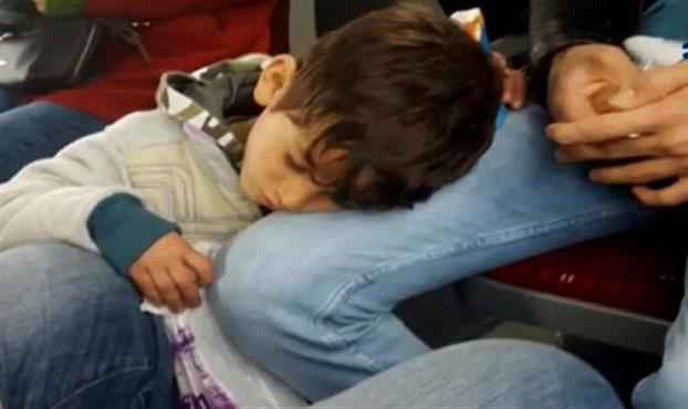Metrobüste mendil satan bir çocuk yorgunluğa dayanamadı ve bir yolcunun dizine başını koyup uykuya daldı. O anlar başka bir yolcunun telefon kamerasına böyle yansıdı.