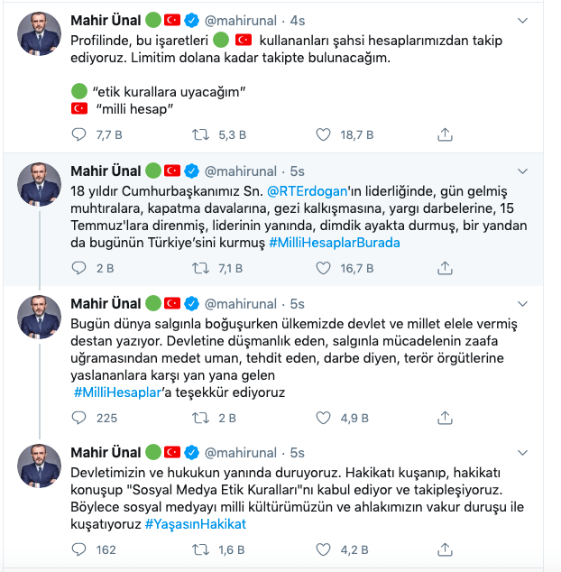 Ünal, profilinde yeşil daire ve Türk Bayrağı kullananları şahsi hesaplarından limit doluncaya kadar takip edeceğini de belirtti.