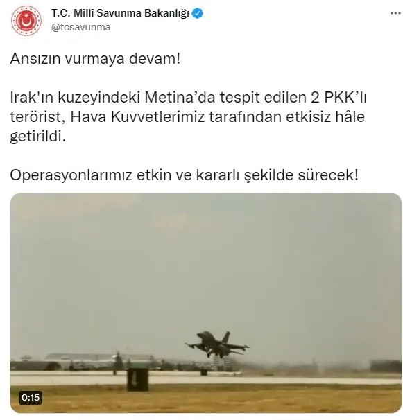Milli Savunma Bakanlığı: Ansızın vurmaya devam! Irak'ın kuzeyindeki Metina’da tespit edilen 2 PKK’lı terörist, Hava Kuvvetlerimiz tarafından etkisiz hâle getirildi. Operasyonlarımız etkin ve kararlı şekilde sürecek!