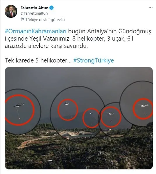 Altun Başka bir paylaşımında ise, helikopterlerin çalıştığı bir fotoğrafı göstererek: "Bugün Antalya'nın Gündoğmuş ilçesinde Yeşil Vatanımızı 8 helikopter, 3 uçak, 61 arazözle alevlere karşı savundu. Tek karede 5 helikopter…" ifadelerini kullandı.