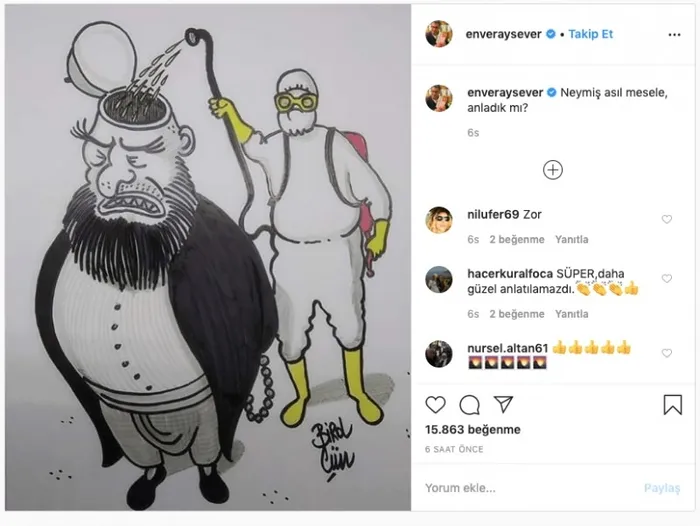 İçindeki kini kusmak için her fırsatı değerlendiren Aysever, bu kez de "Neymiş asıl mesele anladık mı?" mesajı eşliğinde Instagram hesabından Birol Çün tarafından çizilmiş bir karikatürü paylaştı..