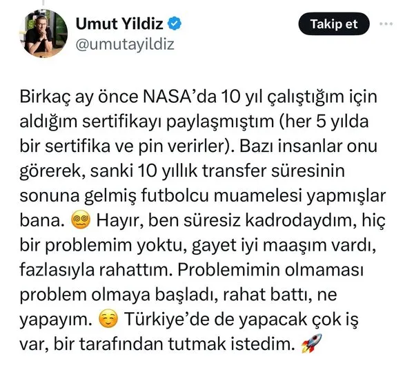 Dr. Umut Yıldız tweetinde, "Birkaç ay önce NASA'da 10 yıl çalıştığım için aldığım sertifikayı paylaşmıştım. Her 5 yılda bir sertifika ve pin verirler. Bazı insanlar onu görerek, sanki 10 yıllık transfer süresinin sonuna gelmiş futbolcu muamelesi yapmışlar bana. Hayır, ben süresiz kadrodaydım, hiç bir problemim yoktu, gayet iyi maaşım vardı, fazlasıyla rahattım. Problemimin olmaması problem olmaya başladı, rahat battı, ne yapayım. Türkiye'de de yapacak çok iş var, bir tarafından tutmak istedim" dedi.
