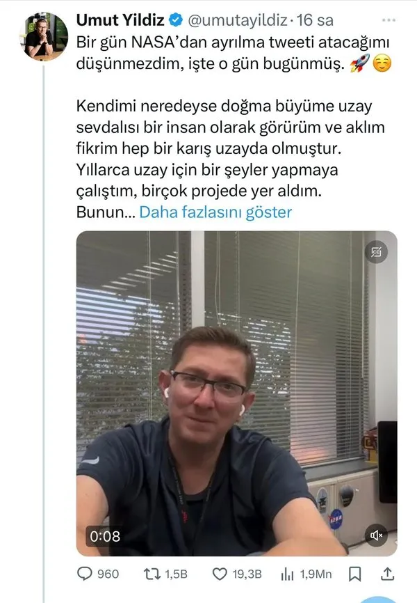 NASA'DAN AYRILMA TWEETİ ATACAĞIMI DÜŞÜNMEZDİM