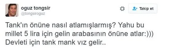 "Yahu bu millet 5 lira için gelin arabasının önüne atlar, tank mank vız gelir" şeklinde çirkin ifadeler kullanan Tongsir'in bu paylaşımı büyük tepkiye neden olmuştu.