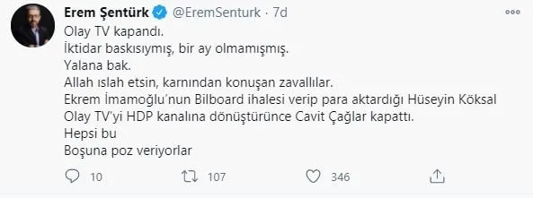 Olay TV'nin kapanmasını değerlendiren serbest gazeteci Erem Şentürk, "Olay TV kapandı. İktidar baskısıymış, bir ay olmamışmış. Yalana bak. Allah ıslah etsin, karnından konuşan zavallılar. Ekrem İmamoğlu'nun Bilboard ihalesi verip para aktardığı Hüseyin Köksal Olay TV'yi HDP kanalına dönüştürünce Cavit Çağlar kapattı. Hepsi bu. Boşuna poz veriyorlar" yorumunu yaptı.