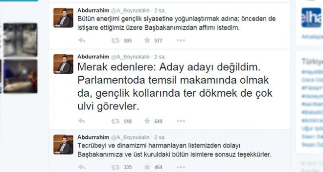 Konuyla ilgili Twitter'dan açıklama yapan Boynukalın: 'Aday adayı değildim. Parlamentoda temsil makamında olmak da, gençlik kollarında ter dökmek de çok ulvi görevler. Bütün enerjimi gençlik siyasetine yoğunlaştırmak adına; önceden de istişare ettiğimiz üzere Başbakanımızdan affımı istedim.' dedi.