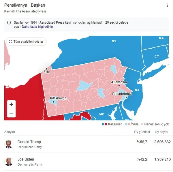 Çarpıcı son dakika haberinin geldiği Pensilvanya seçim sonuçları Biden'ı yıkarken bu eyalet Joe Biden'ın kalesi olarak görülüyordu ve seçimin zafer anahtarını kendisine sunacağı iddia ediliyordu.