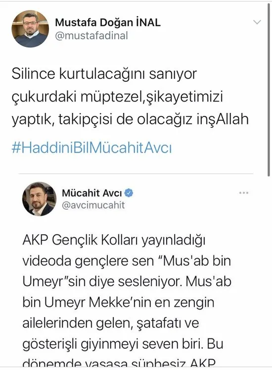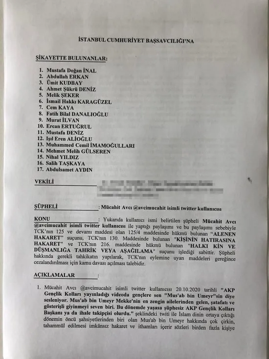 Aralarında Mustafa Doğan İnal'ın da bulunduğu 17 avukatın suç duyurusunda; şüpheli Mücahit Avcı'nın, "Mus'ab bin Umeyr, bu dönemde yaşasa şüphesiz AKP Gençlik Kolları Başkanı ya da ihale takipçisi olurdu" ifadeleriyle, "alenen hakaret", "kişinin hatırasına hakaret" ve "halkı kin ve düşmanlığa tahrik veya aşağılama" suçunu işlediğine dikkat çekildi.